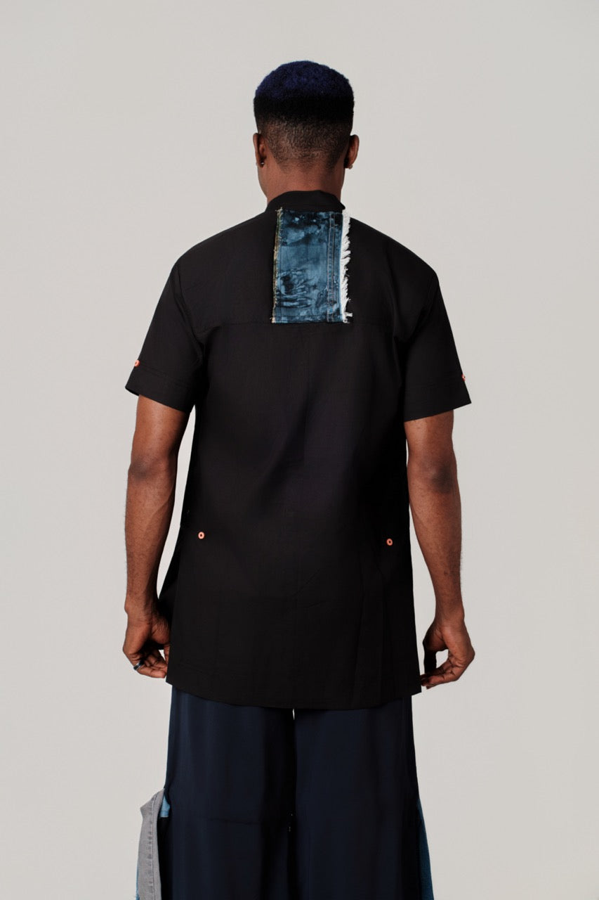 This black short-sleeve shirt commands attention through its innovative asymmetric construction and artistic vision. The mandarin collar provides a refined neckline, while a commanding vertical denim panel dominates the front center, showcasing a multicolored abstract composition in verdant, oceanic, and earthy hues reminiscent of watercolor technique. The patchwork denim integrates seamlessly with the black base, creating striking visual contrast. A deliberately frayed white edge along the panel's left side introduces textural depth and contemporary edge. The design philosophy merges streetwear sensibilities with curated artistic expression, positioning this piece as an essential statement garment for those who prioritize distinctive, fashion-forward aesthetics in their everyday wardrobe.