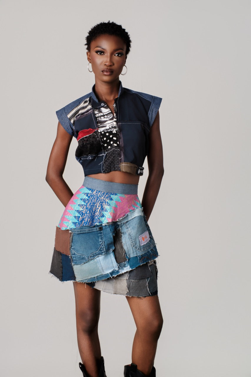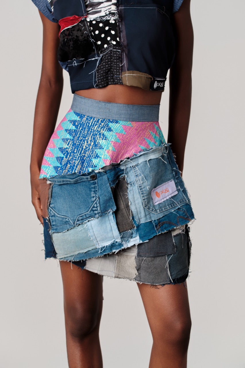 Chori Wrap Skirt: The skirt is a vibrant, patchwork design crafted from recycled denim pieces and colorful woven fabric. It features a soft gray elastic waist for comfortable fit and easy wrapping, bright pink and teal zig‑zag patterned textile with a frayed edge, adding a bold graphic accent,A multiple layered shades of blue denim (light, medium, dark) stitched in rectangular sections, creating a textured, tiered silhouette,At the hem is a raw frayed edges on each patch that gives an edgy, handmade finish.This style is eclectic, up-cycled fashion statement with a mix of boho pattern and rugged denim texture, perfect for casual, expressive outfits.