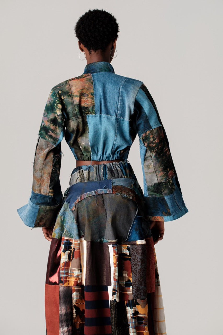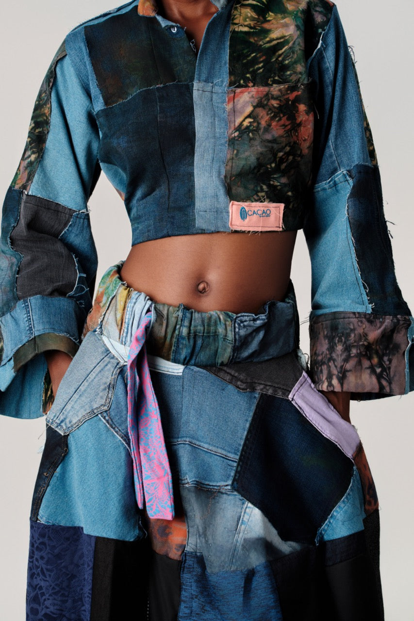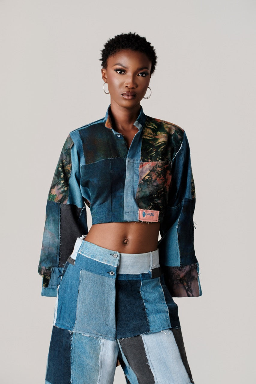 DENIM SHIRT: The top is a cropped, long-sleeve denim shirt styled with patchwork details. It features mixed fabric panels of... Read more