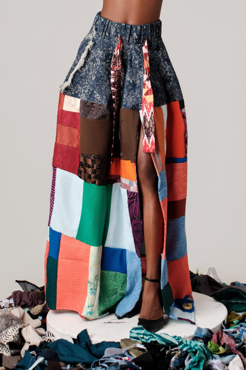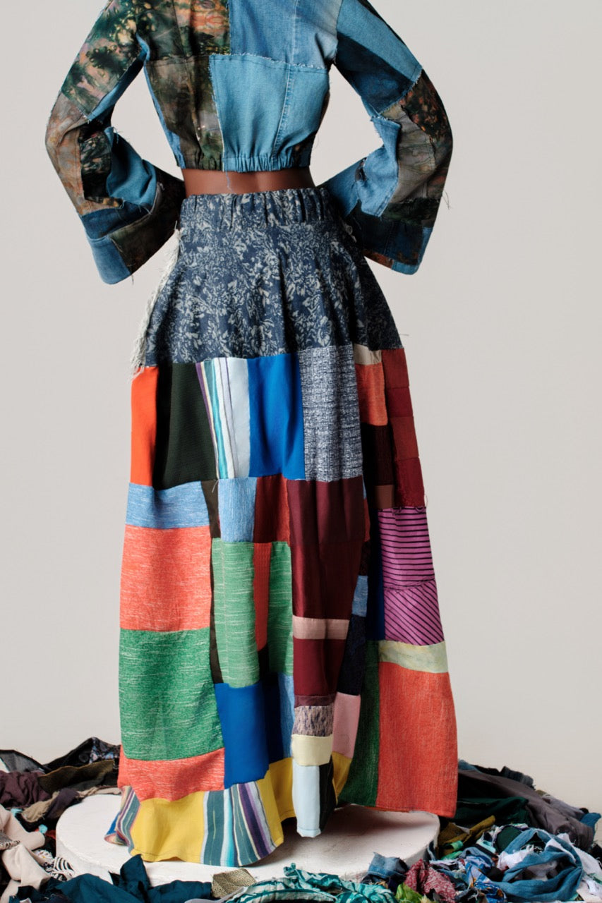 MULTI COLORED MAXI SKIRT: The skirt is a vibrant, patchwork maxi with an elastic waistband in a dark blue floral... Read more