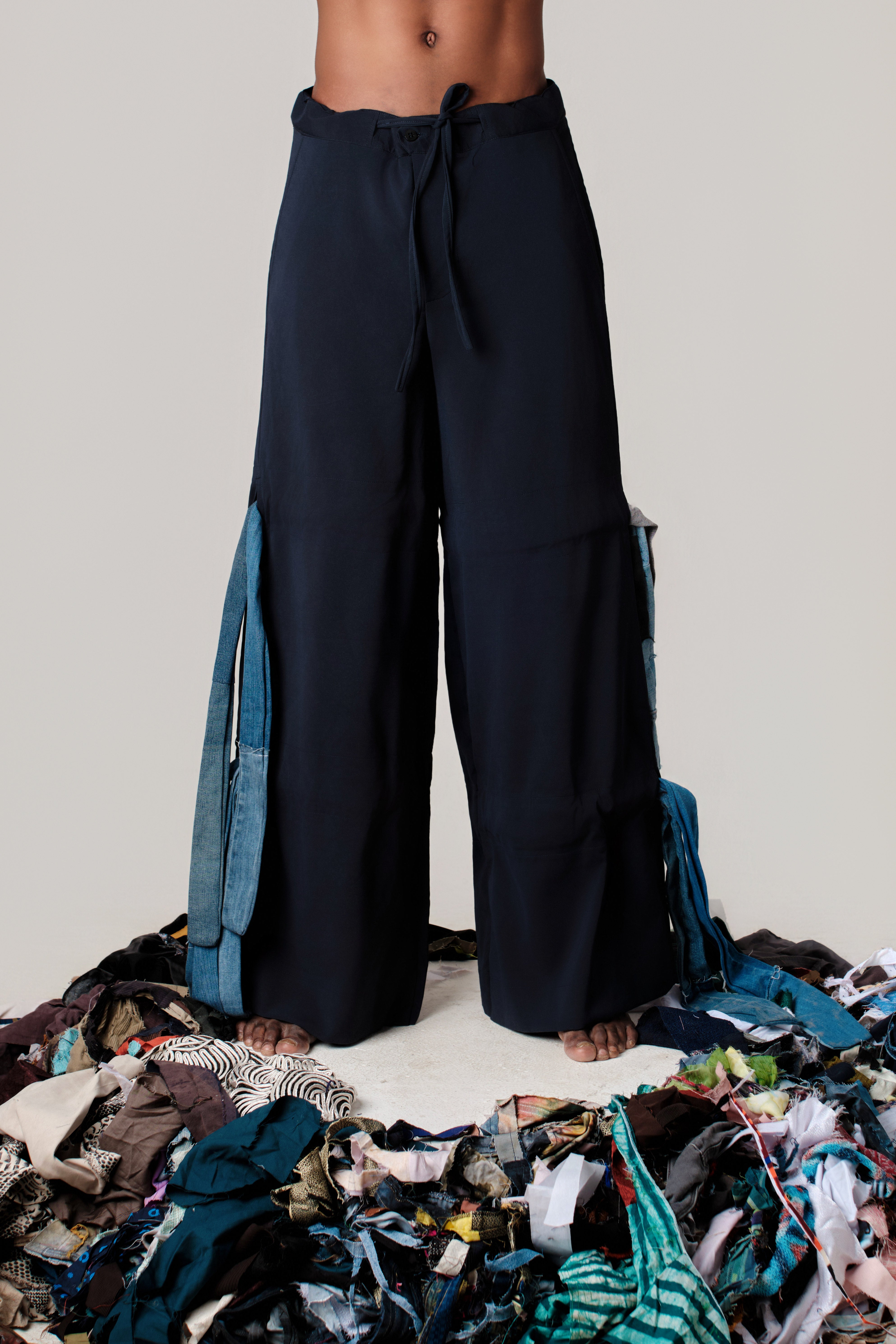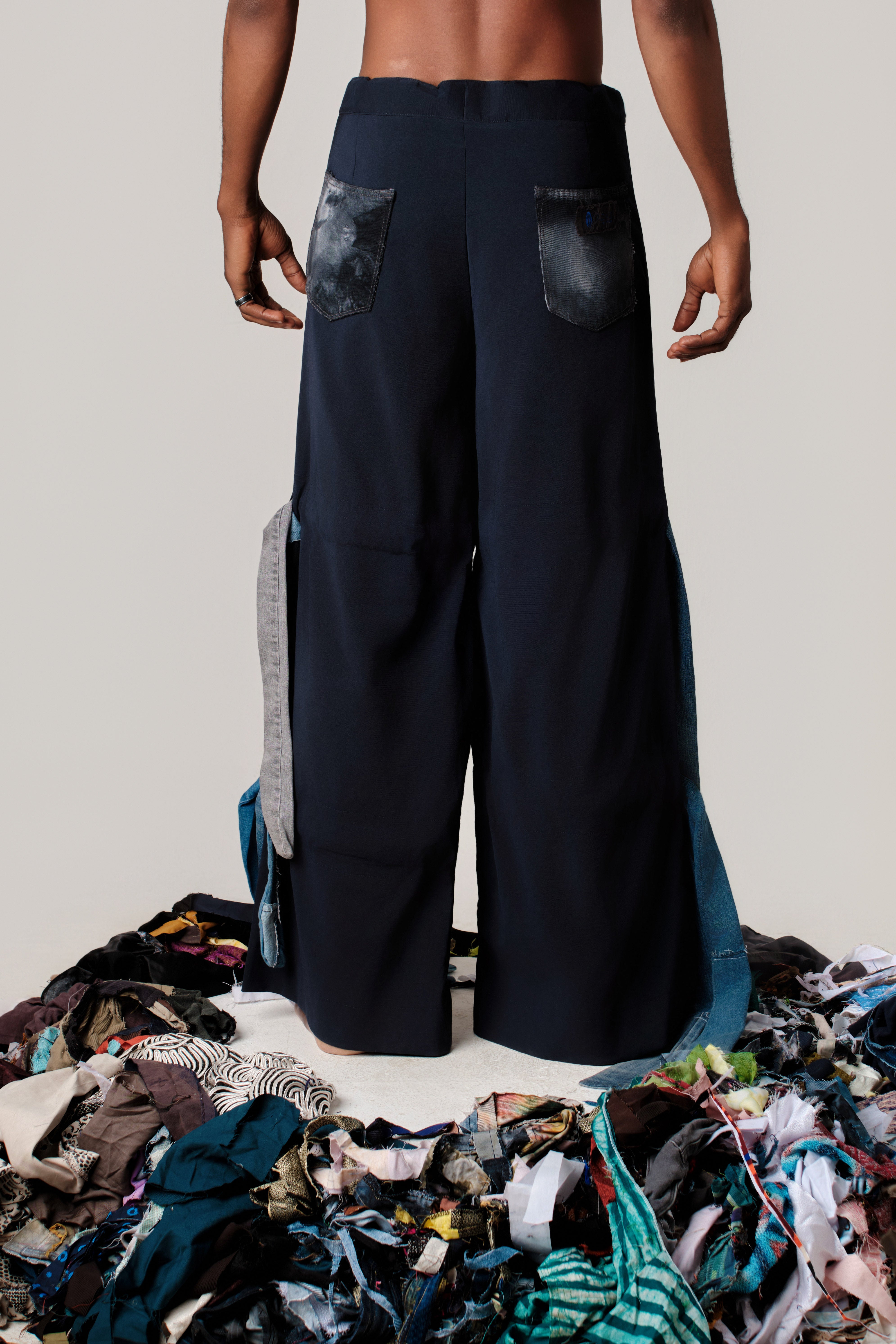 Navy Blue Pants showcasing a deliberately deconstructed aesthetic that celebrates sustainable textile innovation. These floor-length trousers feature a refined navy base paired with strategically integrated recycled denim panels along the side seams, creating visual depth through intentional contrast. A distressed patch pocket on the thigh reinforces the artisanal narrative, while layered denim strips add textural complexity across the silhouette. The high-waisted design includes an adjustable drawstring for personalized fit, and the relaxed wide-leg proportions evoke effortless sophistication. This piece merges contemporary design sensibility with responsible material practices, delivering a distinctive statement in conscious dressing.