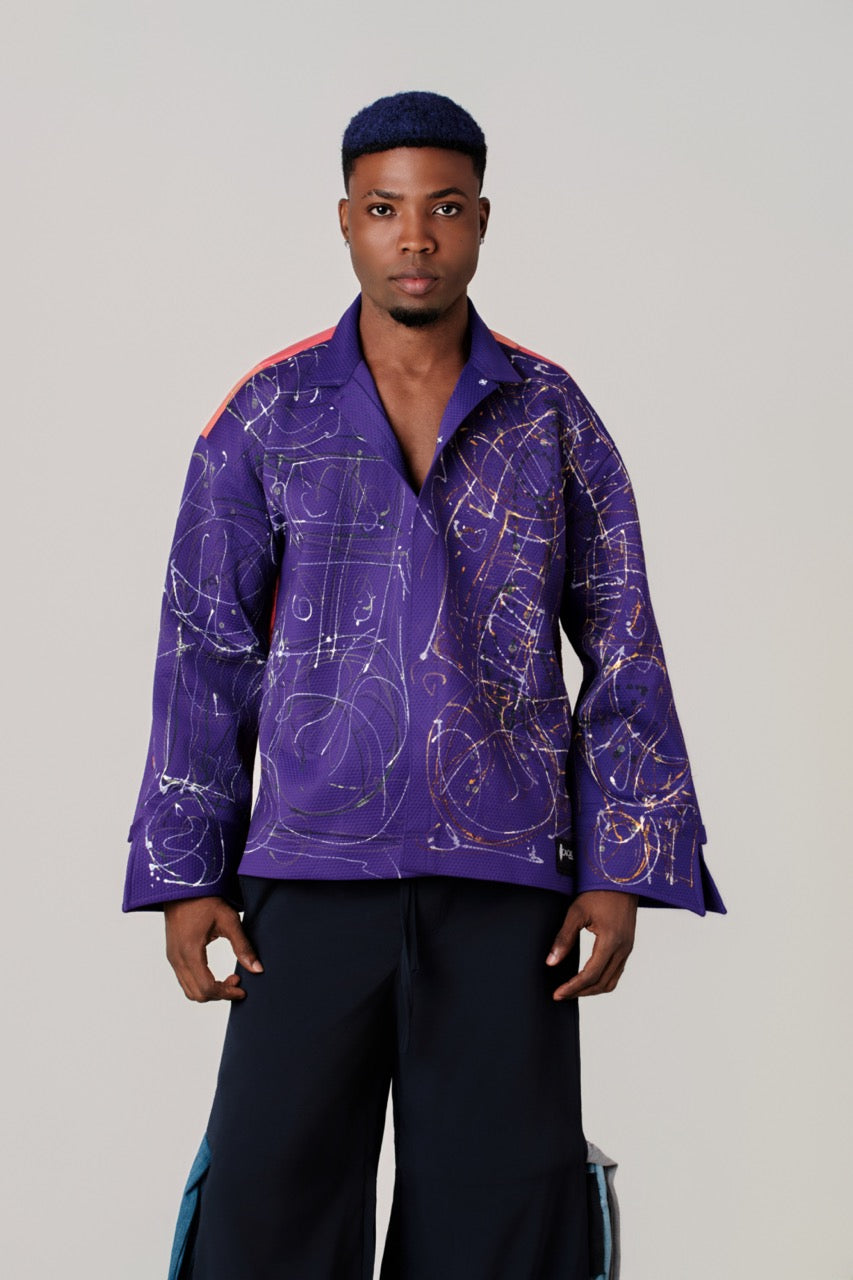 This purple jacket channels urban artistry through its dynamic graffiti-inspired aesthetic. The vibrant base fabric serves as a canvas for expressive white, gold, and muted green markings that evoke spontaneous street art sensibilities. A structured collar provides tailored sophistication, while generously proportioned long sleeves offer both coverage and movement. The textured fabric foundation ensures durability and visual interest, while coral pink shoulder accents introduce unexpected chromatic contrast that elevates the composition. Engineered for cooler climates, this piece seamlessly transitions between seasons while maintaining its bold artistic statement. Ideal for those seeking to merge contemporary streetwear culture with refined tailoring, this jacket functions as both functional outerwear and a distinctive fashion declaration.