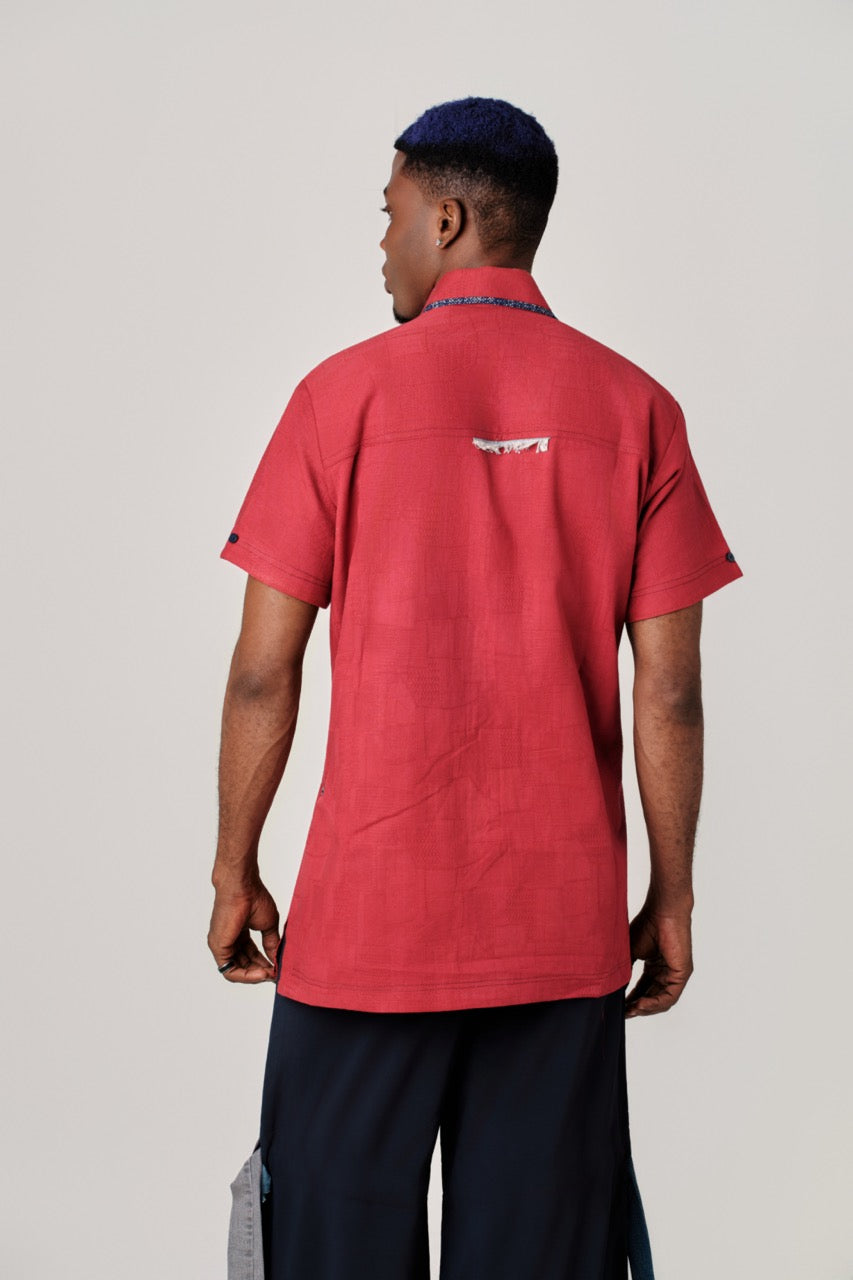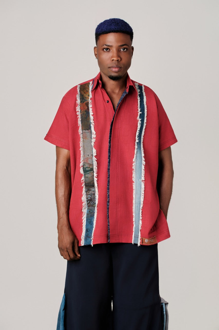 This red linen shirt exemplifies thoughtful design through its fusion of natural fibers and reclaimed materials. The classic button-up silhouette features a structured collar and relaxed fit, while two striking vertical denim panels anchor the front placket. The left panel incorporates faded, patterned denim with authentic character, whereas the right showcases solid blue denim punctuated by a centered dark-blue woven stripe. Raw, frayed white edges throughout underscore the deliberate upcycling approach, revealing the fabric's authentic construction. Visible stitching and a leather heritage tag reinforce the garment's artisanal quality. The result is a versatile piece that balances refined tailoring with contemporary mixed-material aesthetics, ideal for those seeking distinctive, sustainably-minded fashion.
